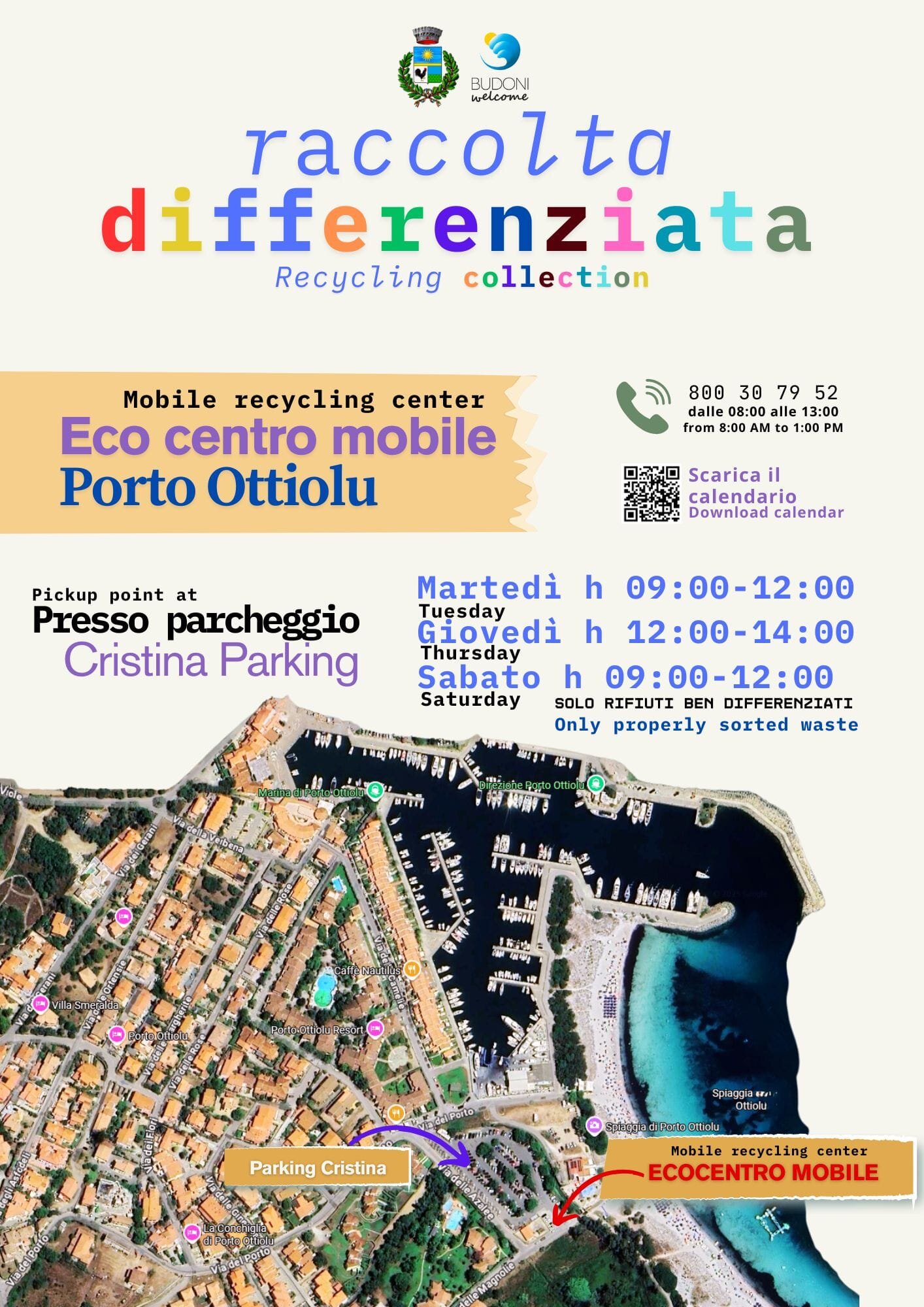 OTTIOLU – parcheggio Cristina (Spiaggia grande) – il martedì e sabato dalle ore 09:00 alle ore 12:00 e il giovedì dalle ore 12:00 alle ore 14:00
