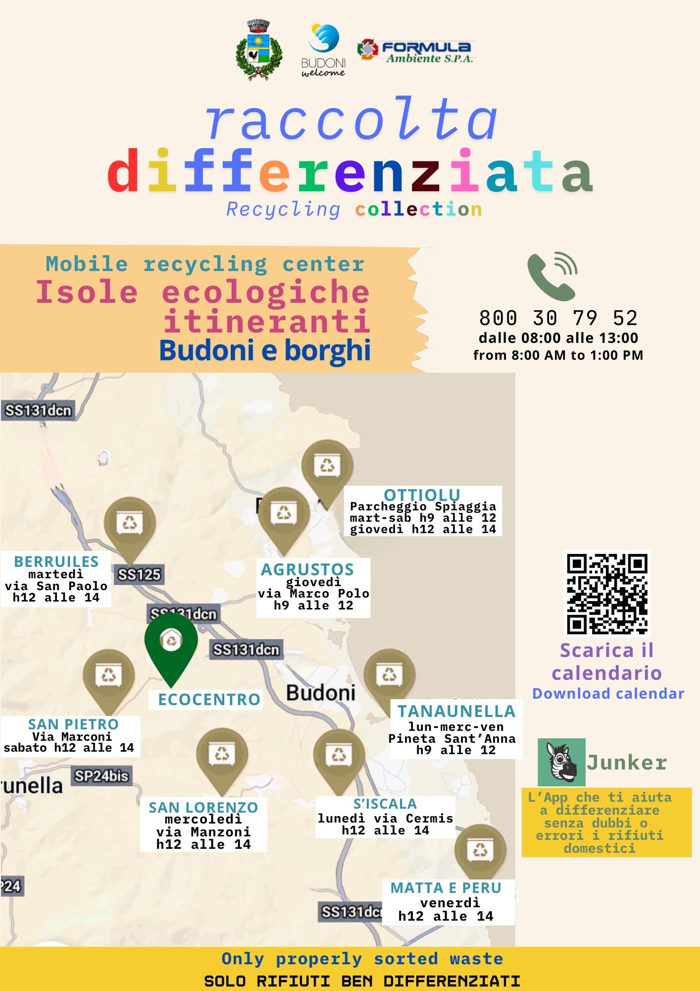 il servizio di raccolta differenziata è attivo non solo mediante ritiro presso il domicilio, ma anche tramite l’Ecocentro comunale e, fino al 30 settembre, attraverso le isole ecologiche itineranti presenti in diverse località del territorio comunale, secondo gli orari di seguito indicati:
